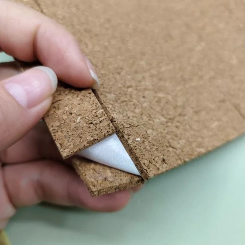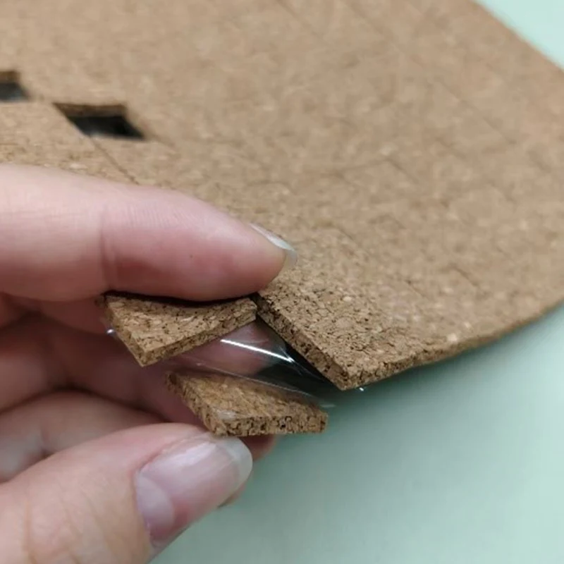 1/8" x 3/4" x 3/4"-es parafa szállítási alátétek tapadó hátlappal, főként parafából és eltávolítható ragasztóból, valamint papírból vagy átlátszó PET-ből, mint bélés a hátoldalon, dobozba csomagolva lapok vagy tekercsek formájában, az alábbi ábrán látható módon: